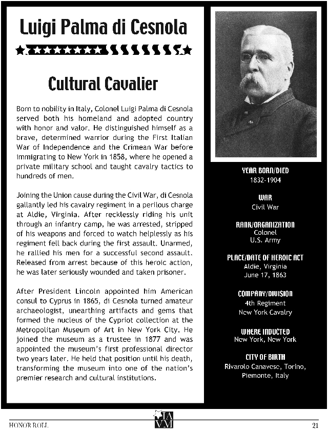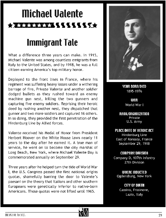 There are actually three versions of the Medal of Honor: one each for the Army and the Air Force and third for the Navy, Marine Corps and Coast Guard. The Medal of Honor on display in this exhibit was bestowed upon the Italian American Veterans Museum by the United States Army. Our Medal is showcased in a display that honors the 26 Italian-American recipients of our nation’s highest honor. Here are five of their stories.